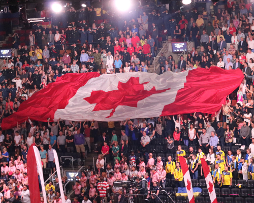 安省省长Kathleen Wynne护送会旗入场后,注目升旗仪式