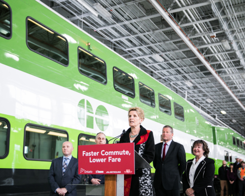 促使乘坐GO公交网络车辆更易于负担,降低车资来改善接驳车辆通勤,将能为住在GTHA地区内的省民每日都带来更大的方便。此外,削减车资将更有助于减低地铁及巴士的挤迫情况,省民也有多些交通工具的选择。标题图片为省长宣布降低车资的措施。图右为安省交通厅厅长麦嘉丽。