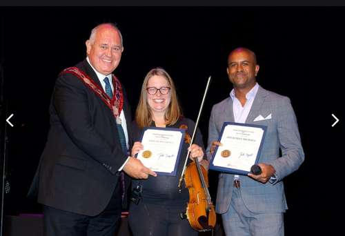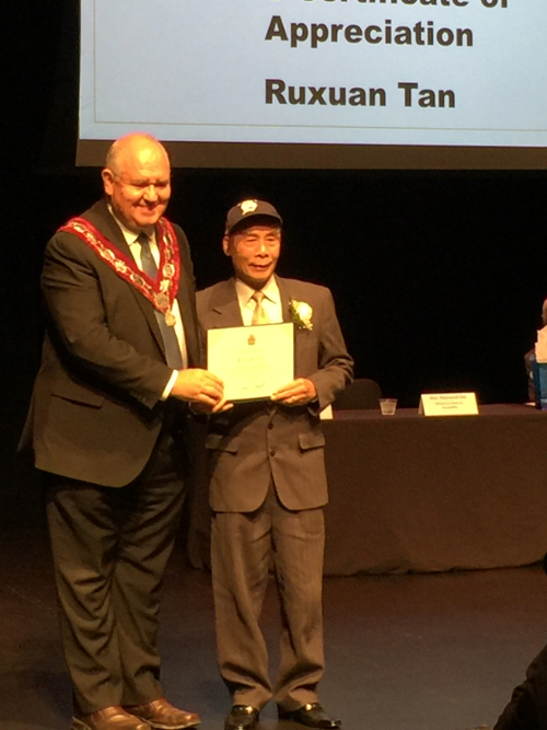 本次提名了24名杰出长者候选人,经过委员会评选,最后选出了6名杰出代表并颁发证书作为嘉奖。表彰他们为丰富我们的社区生活而呈现的典范志愿精神和做出的卓越贡献。值得一提的是,本次有两位华人获此殊荣。其中一位是由“欢乐人生”这个有百余人的群众组织共同举荐的谭先生。市长长者名人堂委员会主席Yash Kapur在表彰中提到:我们不同的人群说着140多种的语言,但有一种语言,我们谁都能听懂,那就是音乐。有一位76岁的“年轻人”,他总是骑着他的自行车,不管晴天雨天,风里雪里,带着他的乐器给大家伴奏,教大家唱歌,他的热情和专业的演奏水平深深吸引了许多朋友……这个“年轻”的老人就是谭儒宣。