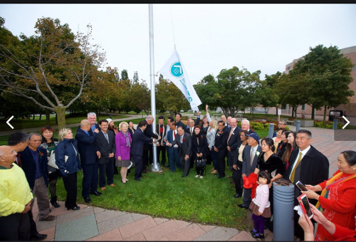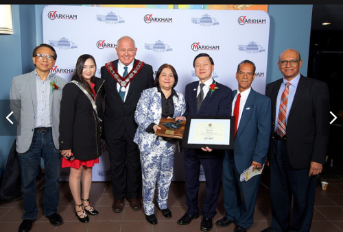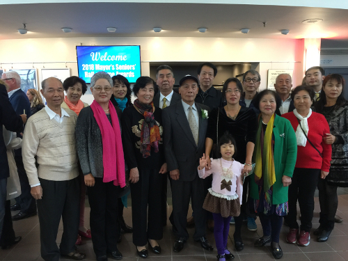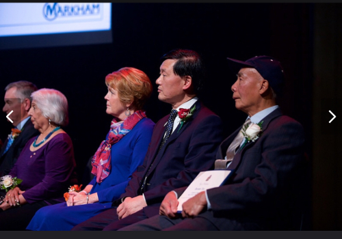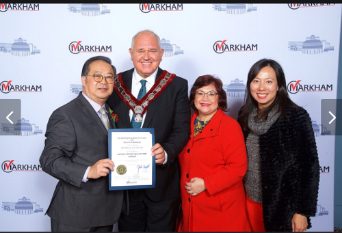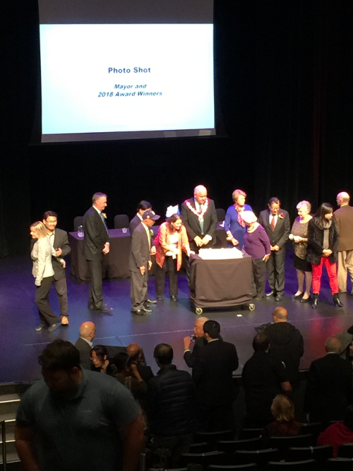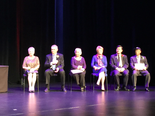 下午五点,万锦市市长Frank Scarpitti 在接待厅开启了简短的官方欢迎仪式。紧接着,Jonathan Michael讲话并欢迎各位长者与来宾,还举行了庄严、隆重的升旗仪式。随后,2018年万锦市市长长者名人堂颁奖典礼在华丽典雅的万锦Flato大剧院正式举行。市长Frank Scarpitti在开场白中反复提到为老年人感到骄傲!为老年志愿者对社区做出的巨大贡献感到骄傲!这个颁奖典礼和升旗仪式就是向60岁以上的人们表示敬意和感谢的绝佳时机,感谢他们的帮助使万锦市成为居住、工作和娱乐的好地方。