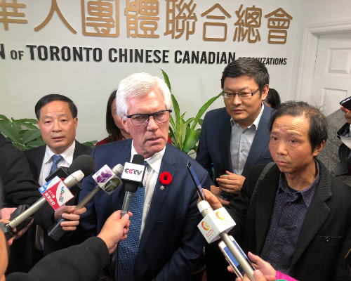 与此同时,11月5日下午,联邦国际贸易多元化部长Jim Carr前往华裔重镇士嘉堡,与近30位华裔社区代表,举行闭门圆桌会议。记者预计,部长与华裔代表通报11月11日前往中国的部长级访问,希望借加拿大华社之力促加中贸易与经济发展上新的台阶。自由党政府借机也在为2019年联邦大选造势。华裔联邦国会议员谭耕和Jean Yip出席该次圆桌会议。久候在外近20位华裔媒体代表在会议结束时才允许入内为参与圆桌会议的宾客合影。