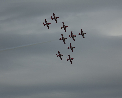 除了地上摆放的飞机,空中表演更能够吸引观众。当笔者在现场时,正碰上加拿大国宝–雪鸟机队表演(Canadian Forces Snowbirds)。究竟看过N次,十分熟悉,时隔多年,它们表演的队形好像没有什么新花样啊!从官网看到,除了雪鸟表演,这两天飞上天空的还有CF-18 Demonstration Team,Canadian Armed Forces Parachute Team “The SkyHawks,RCAF CT-155 Hawk,KC-135 – Alaska Air National Guard,T-33 “The Black Knight”,A-10C Thunderbolt II Demonstration Team,Jet Aircraft Museum – Canadair CT-133 Silverstar “Red Knight”,Vampire Airshows – de Havilland DH-115 “Vampy Too”,T-38 Talons,Aerobatic pilot and Red Bull Air Racer, Pete McLeod和Aerobatic pilot, Mike Tryggvason,总体来看,花样不少!