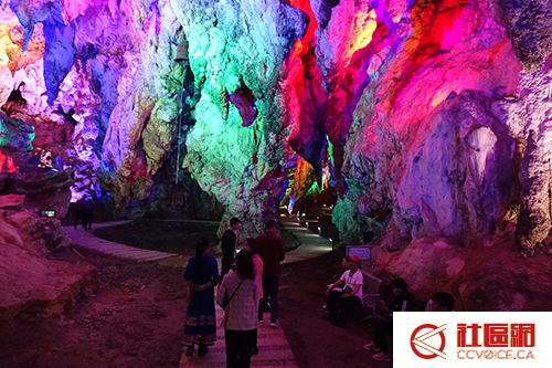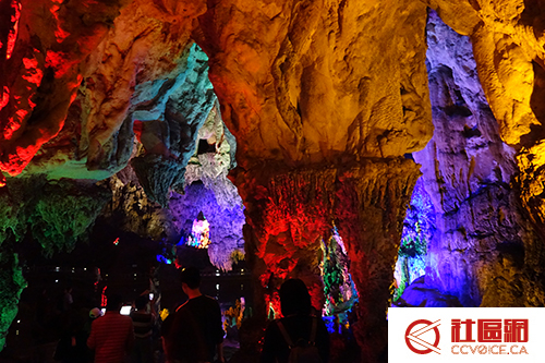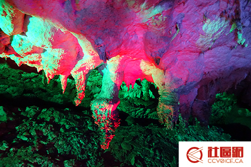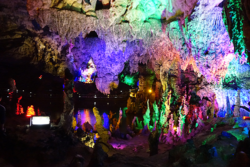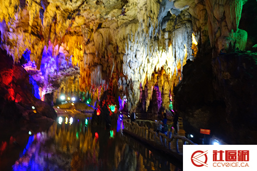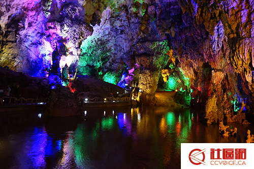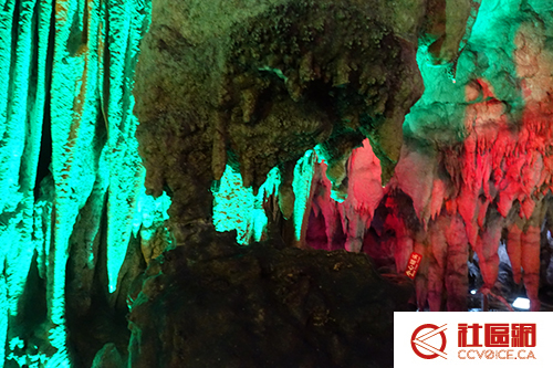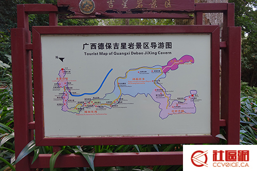 还没有入洞,讲解员就告诉咋们,洞前的两棵树,一棵是千年七叶树,一棵是桑树王,就是吉星岩的守护神。两棵树巍然矗立,直插云霄,真有点钢铁卫士的感觉。吉星岩洞口开阔,而洞内则水陆兼备,分为暗河、中层洞和摩天洞三层,目前游人能参观的是中层,分为吉星迎宾、福如东海、瑶池仙境、诗画壮乡、花好月圆等5个游览区,游程约2公里。据地方领导表示,暗河正在开发中,计划将其开发成漂流区。