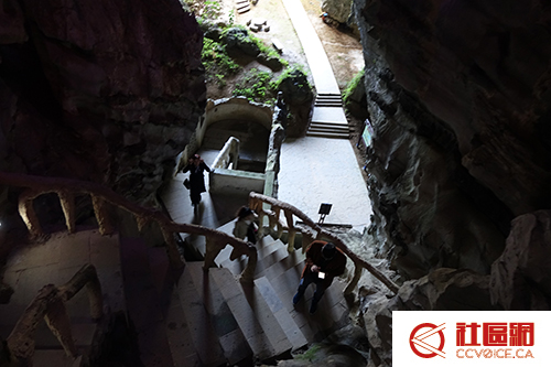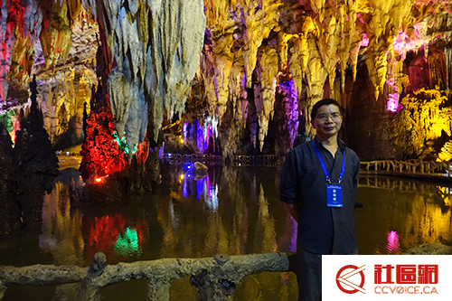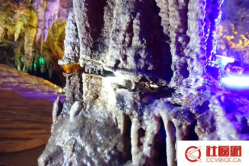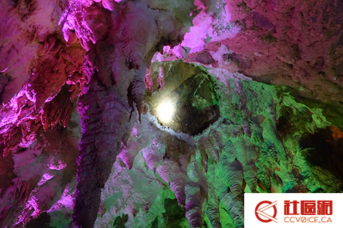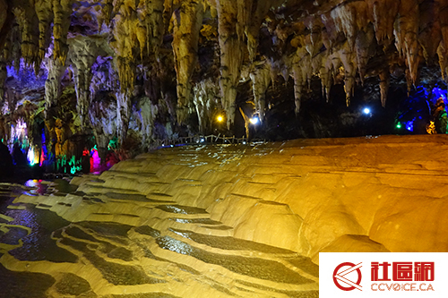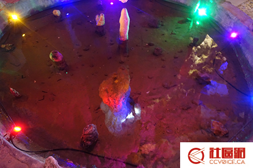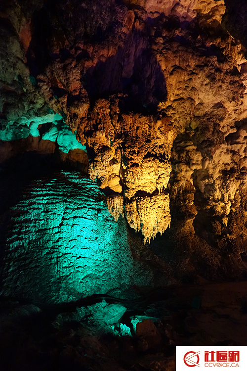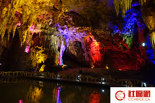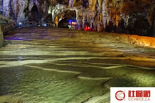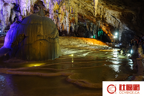 吉星岩溶洞内,金稻铺地的壮乡秋色和如同万丈深渊的钟乳石倒影让人惊叹不已,大自然在这里创造了一幅幅壮美的图画,就如同技艺精湛的石匠潜心雕凿出来的作品一般,那么逼真而富有意趣。最为壮观的莫过于钙华池,这是由钙华堆积而成的题梗儿形成,成群分布,依地势层层叠叠,状若梯田,面积多达6,000平方米。让笔者不由得傻傻地问讲解员,“这不是人工打造的吗?”而神来之笔,在浩大的钙华池中,竟然悄然屹立着一尊黑色的大钟,从另一个角度看又似粮仓,黑白交映。