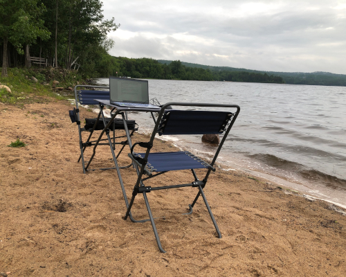在第三天,我起床比较早,而孩子们依然在帐篷里睡觉!考虑到天气不错,而离沙滩不远,我拿起自己的简易办工桌,在湖边工作。原因呢?因为水边没有或很少有蚊子啊!