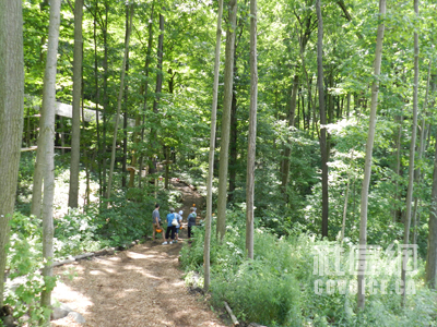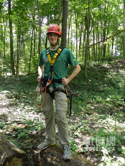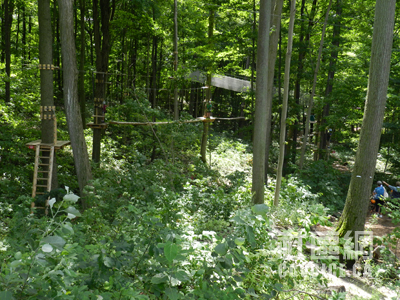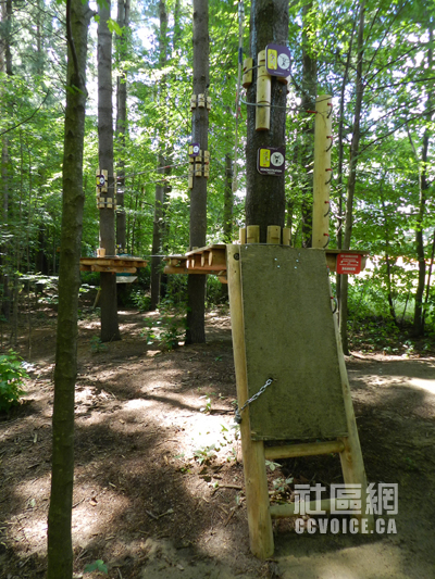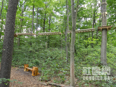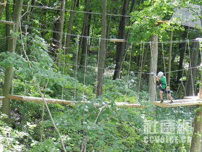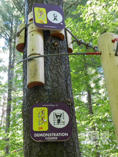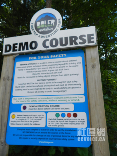 记者到达时,Boler Mountain公园负责人Marty Thody予以热情接待,并派出工作人员Jessica驾车,带记者参观树上探险公园,一边介绍,一边解释。在公园入口左侧,那里是公园服务处以及探险器材租赁中心,同时有小型商店供游客使用。工作人员会手把手教你如何安装所有器材。当你全身“武装”之后,你才能进入靠近大门的运动解说处(Demonstration),也就是最为简单的树上探险设施,让你真实体验。在这里,你应该学习的项目有Zip Lines,Rope Courses,Swinging Bridges,Tarzan Swings和Pirate Nets,也就是主要机能。只有通过这个基本技能之后,你才能真正进入树上探险公园。