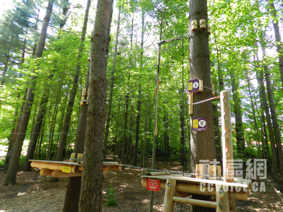 沿山而上,树上探险公园设立在一片全自然的Carolinian森林之中,在滑雪顶峰的背面。根据Edelrid Smart Belay安全系统,游玩树上探险公园对身高要求是非常严格的。针对不同年龄段的游玩者,提供不同的障碍挑战项目和挑战路线。对于该树上探险公属于中等规模,多条线路供游玩者,每条线路的难度不同,基本上有8-12个障碍挑战项目。对于选择Junior Course的游玩者来说,伸手可及高度要达到5尺,也就是8-12岁,而其他项目需要达到5尺11才行。成年人是不允许参与Junior Course的,体重要求是50至275磅之间,应该是一般人的体重范围都能满足,每个项目历时2-3个小时。