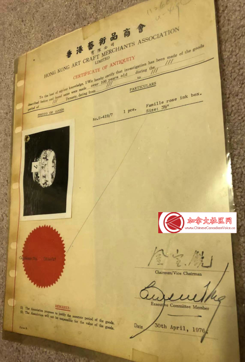 其实笔者收到这个连盖粉盒已经有些时日,详情还真是记不太清楚!不过,好在当时购买这个宝贝时就附有香港艺术品商会(Hong Kong Art Craft Merchants Association)出具的鉴定证书,时间是1976年4月30日。对于笔者来说,看到物件并附有这一纸证书,自然不会怀疑其真实性!原因很简单,笔者从网上查阅过签发证书的机构,很有来头。