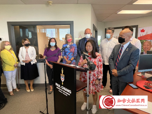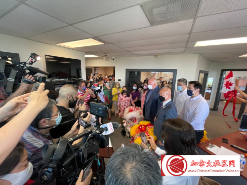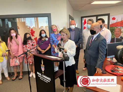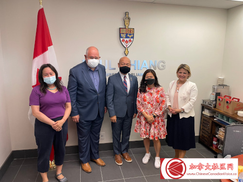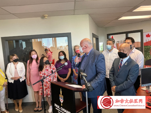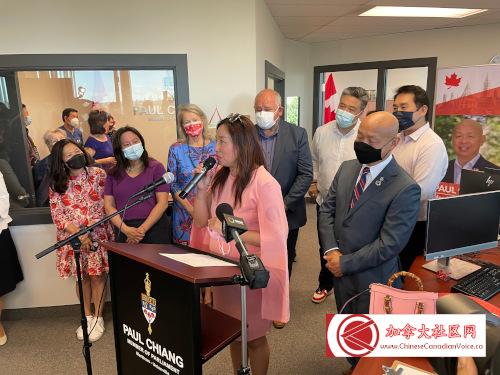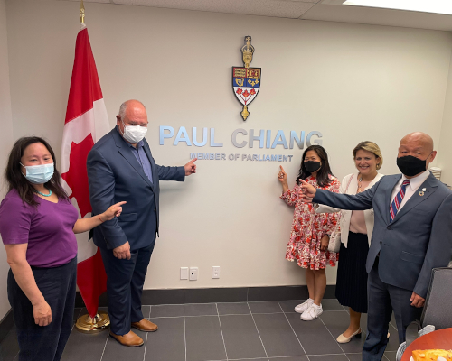 5月14日下午联邦多元及包容事务部长议会秘书(Parliamentary Secretary to the Minister of Diversity and Inclusion)、万锦-于人村(Markham-Unionvill)联邦国会议员蒋振宇(Paul Chiang)选区办公室隆重开张。联邦小企业、出口促进及国际贸易部长伍凤仪(Mary Ng)阁下、万锦市市长薛家平(Frank Scarpitti)、邻近选区国会议员陈圣源、Jean Yip、董含鹏与Leah Taylor Roy,以及和万锦市第六区市议员杨绮清到场祝贺。