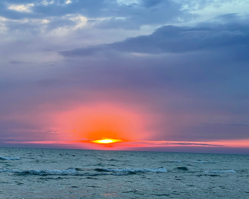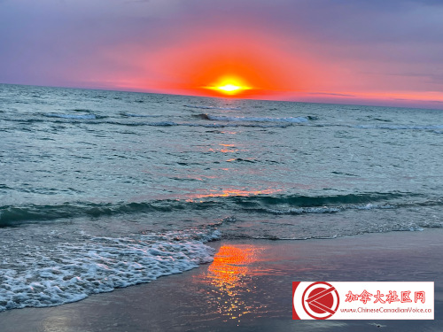 沙滩上的游人比我想象的要少,而在水中游泳的人更少!脱掉拖鞋,水温依然有刺骨的凉意!我们到达时,天边云彩颇为浓厚,没有想到有机会看日落。但是在沙滩上步行一阵之后,笔者发现日落之处竟然一片火红,尽管没有看到一整个太阳,但日落之美景,真的让人震撼!运气还真的不错,看到日落那一瞬间,感觉一天的辛劳都很值得!