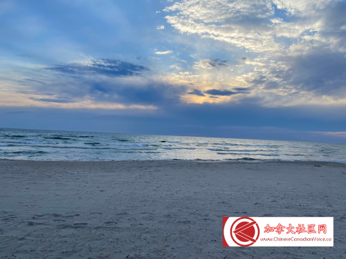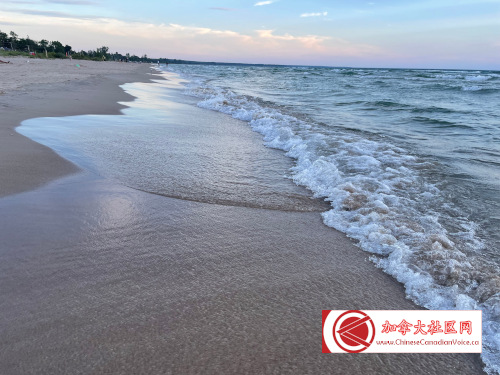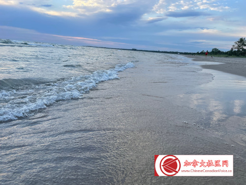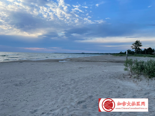 从Sauble Falls省立公园去Sauble Beach很方便,几公里的车程!从营地出来,返回13号公路,往南走几公里,选择一个支路右拐,一直往前行就会到达沙滩边。究竟是傍晚,沙滩上人不多,因为在靠近沙滩的道路旁停车很方便,之后,翻过路旁的小沙丘,就到了沙滩上!