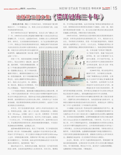 2020年是郝伟出国三十周年,为此编辑出版第三部文集《漂洋过海三十年》,名人白岩松特意为文集撰写序言。这部文集除了继续分享郝伟与两个女儿在加拿大的移民生活和学习以及外出旅行之外,还记录了1990-1994年郝伟在英国自费留学的艰辛历程,并感恩三十年的海外生活中遇到的几位良师益友。
