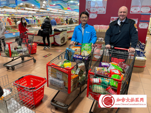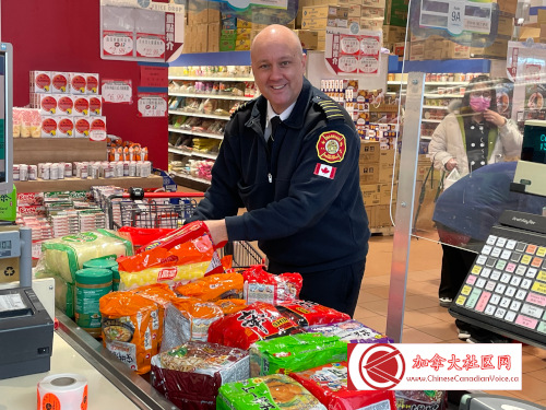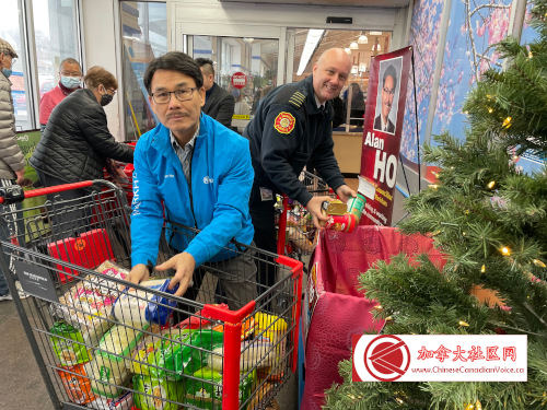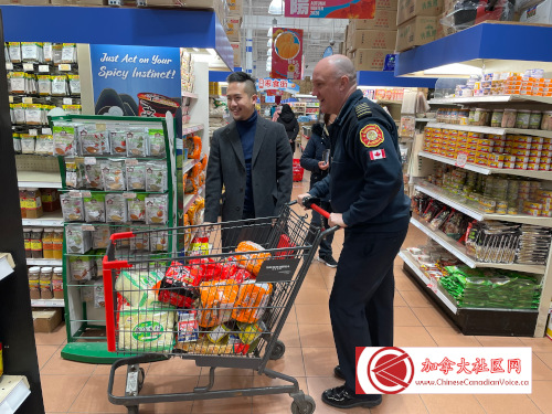 媒体活动之后,Alan Ho与消防局长Adam推上购物车,现场精心采购了$400多加币食品,捐献给食物库!而鼎泰超市更是大手笔,为食物库捐献了一大批食品。当天活动所募集到的食品,估计能够支持十几个家庭一个月的消耗!假如读者有机会路过Hwy 7与McCowan的鼎泰超市,大家一定会看到入口处的大型捐物箱,热情伸出你的援手,为食物库捐献食物或现金,实现社区万家灯火。