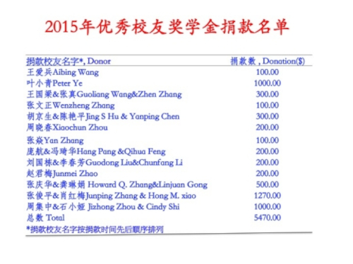 非常高兴告诉大家,今年我们收到13位校友的捐款,总数为5470美元。这是我们历年的最高记录!谢谢这些校友给我们的年轻校友的慷慨支持。以下是他们的名字和捐款数。