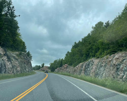 无论是前两天的气候,还是周末预报,天气可能下雨!当儿子问需要带游泳裤时,笔者还是建议带上,万一用得着。因为一早赶路,路况不错,沿着高速400往北走,一路顺畅,基本上都是自动巡航驾驶。唯一有些堵车的是Sudbury有60-70公里时,警察在指挥车辆通行,但笔者运气不错,几乎没有等待就通行,而往南的车辆却排成长龙,估计要等上一段时间了。