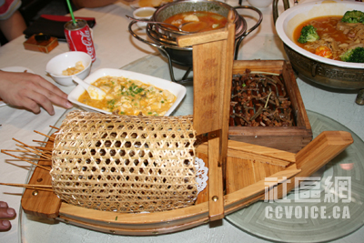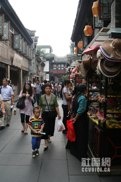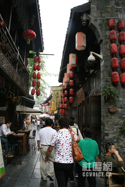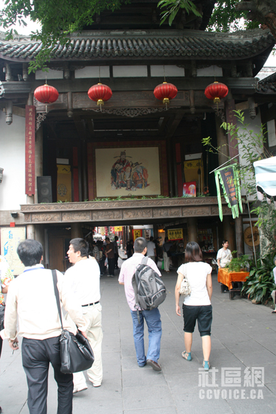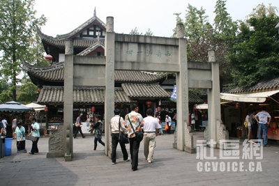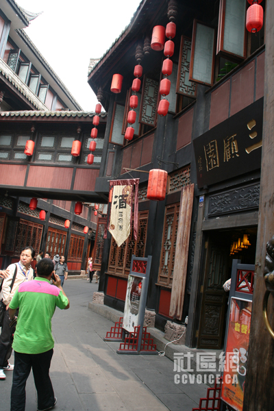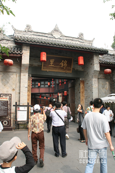 尽管联合采访团刚从成都大熊猫繁育基地采风回来,但锦里的文化一下子让大家凝重,似乎时光退回一千年。非常感谢主办方的周到安排,因为当日中餐就在锦里入口处的“三顾园”中解决,亲近历史上的成都。笔者认为,锦里的特色不仅在表面上,即建筑风格上,而且也表现在内涵上。比方说,“三顾园”餐馆的菜单就沿用了很多大家熟知的三国故事或传说。吃饭时计划将菜单抓拍,但后来竟忘记此时,所以尽管拍了很多菜的照片,但对得上号的也就是“草船借箭”了,其他的如张飞牛肉、三大炮等却不知所云。但愿将来还有机会旧地重游,再补不迟。