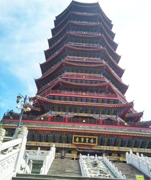 靖宁宝塔位于曲靖市麒麟区寥廓山森林公园内,塔高81.6米,目前是中国第三高人造塔。主塔层数为9层,总高81米,由塔基、塔身、塔刹三部分组成;“靖”是今天曲靖的代称,“宁”是古代曲靖的代称,名称融汇了曲靖作为历史文化名城的意味。通往静宁宝塔的台阶共分三个大阶。最底层为9阶;中层分为递进式6段:每段均为18阶,合计:108阶;最上层为左右贯通,以22阶成行。三大台阶共计:139阶。靖宁宝塔主体共九层:整个外形最快入眼的便是“福”份。第一层四个正面均是3“福”,共为12“福”。从第二层至第八层,每层正面皆为1“福”,每个正侧面亦有1“福”连接,每层就为8“福”并存;如此算来,八层全“福”68份。第九层的顶部是一尊福佑曲靖人民的金佛。九层宝塔有八十一点六米,意喻九九八十一即九九归一。