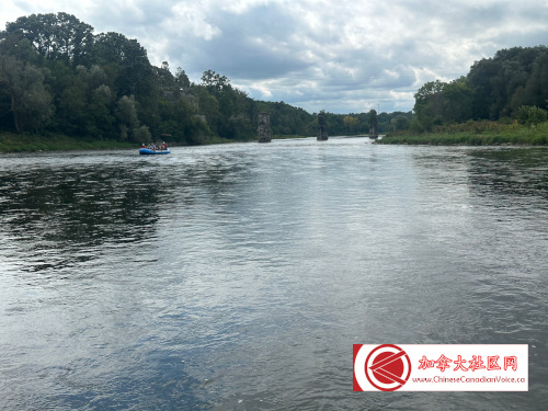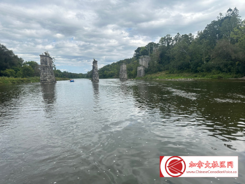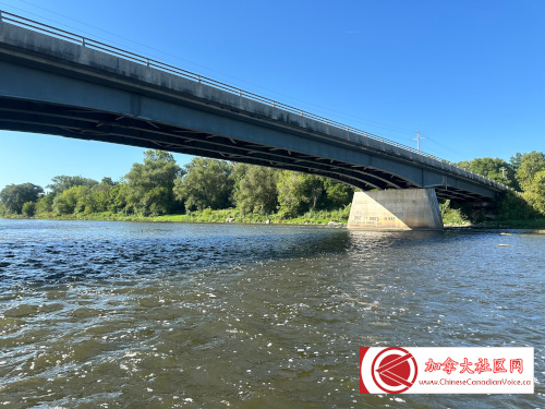 终点来得有点快,下午1点过一点就到了!这是我看到铁路桥才意识到的,因为疫情期间来这个看过好几次。假若直接冲过铁路桥,那就是一个大坝,颇为危险的!假若继续的话,需要上岸,走过大坝后在下水,就能够前往Brantford,这应该是笔者的下一个目标。到岸不久,一对夫妇划着Kayaka在这里上岸。据介绍,他们先开车到这里,留下一辆车,然后开一辆车去Cambrige,在那里下的水。上岸后,他们还得开回去取车。看来Kayaka比SUB要快一点,他们9:45下水,1点半到。老头表示,许多浅滩他太太就飘过去了,而他就陷在其中,我开玩笑说,“那得注意一下自己的体重!”他们忍不住大笑!