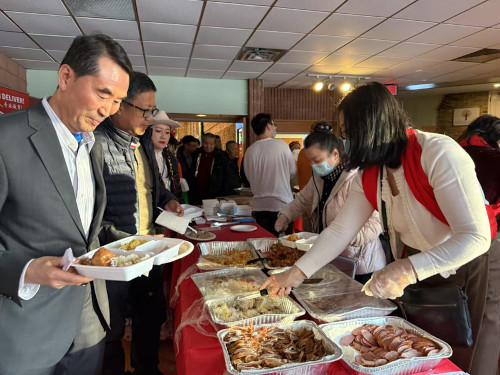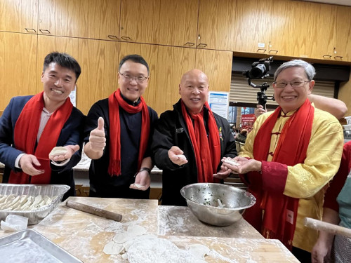 国会议员蒋振宇、列治文山副市长陈志辉、市议员崔冰辉与吉林协会副会长Jason Gao共同与志愿者一起包饺子庆新年