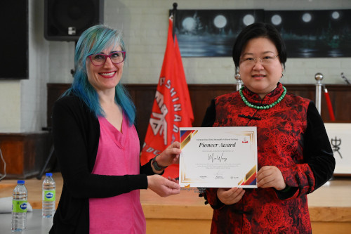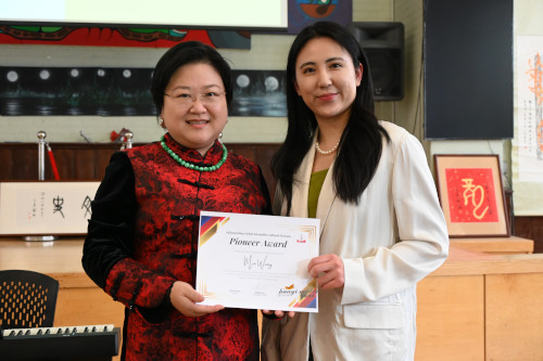 展览现场,加拿大中国书画院院长石介与常务副院长毕云来为嘉宾和观众详细讲解了每幅作品的创作背景和艺术特色。来自世界各地的书法名家也纷纷分享了自己的创作心得和对书法艺术的理解。论坛期间,ICH执行董事兼GCHN主席Angela Liu为专程从北京赶来的中国三百年中医世家传承人、中国国家一级艺术大师、萨王大熊猫文化创始人王敏颁发了“Pioneer Award”,以表彰其在非物质文化遗产保护和传承方面的突出贡献。