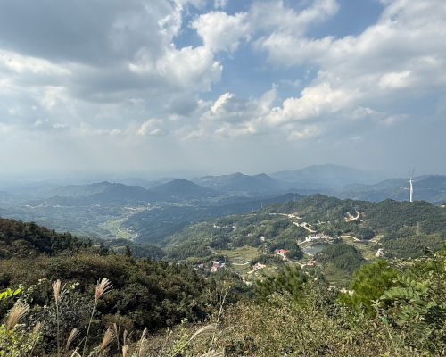 时值10月11日,一个因调休而成的工作日。山上格外宁静,民宿前庭空无一人,唯闻风过叶隙的细碎声响。这份难得的清寂,反倒成全了我们自在赏景、尽情拍摄的时光。更幸运的是,天气出奇地好。碧空如洗,白云如絮,阳光慷慨地洒满山峦。站在峰顶,恍若置身云端,视野无限开阔。远山叠翠,田畴村落如画,风车叶片悠悠转动,发出低沉而有韵律的嗡鸣,仿佛为这山间奏响一支悠扬的乐章。
