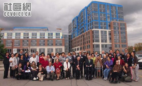 安省省督安利,众嘉宾 以及孟尝护理中心人员在即将落成的孟尝护理大楼前合影