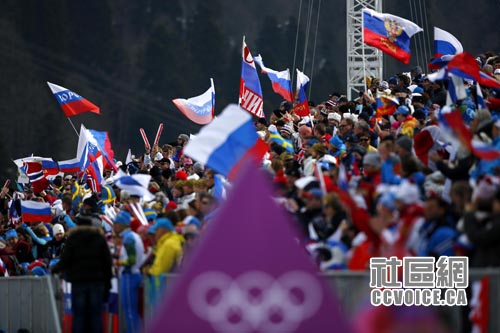 当地时间2月11日,在索契冬奥会越野滑雪赛场,观众气氛热烈