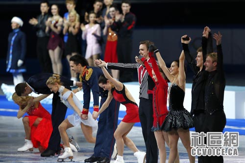 当地时间2月9日晚,索契冬奥会花样滑冰团体赛圆满落幕,东道主俄罗斯队以四项积75分的成绩摘得金牌,这也是俄罗斯代表团在本届冬奥会上摘得的首枚金牌。加拿大、美国分获二、三名。图为俄罗斯队在颁奖仪式中向观众致意。