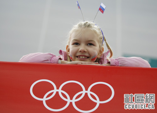 当地时间2月11日,在索契冬奥会速度滑冰比赛中,一位小观众头插国旗站在场边(由中新社供稿)