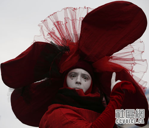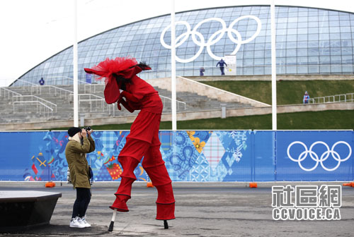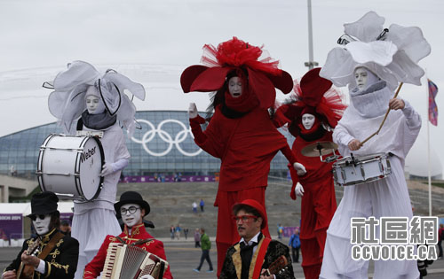 当地时间2月11日,化妆夸张的表演者在索契奥林匹克公园巡游,与游人互动