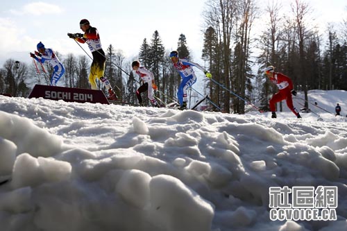 当地时间2月11日,在索契冬奥会越野滑雪男子自由式冲刺比赛中,选手们艰难前行