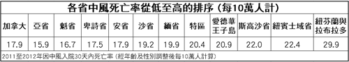 全国各地的中风存活率不一。若在魁省或亚省发病,存活机会较高。各省有不同的中风死亡率,原因可能很复杂,其中包括病发地点是城市还是乡郊、中风服务协调的顺畅以及现有服务等。