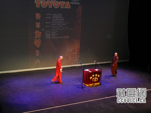 在导演李权翰嘹亮的开场喜歌声中,诸位相声大亨隆重登场,并给观众做了个性十分特别的介绍。在李权翰修正版,Toyota广告词“有路就有丰田车”的解说中,Jason张走向舞台,想在座所有观众致以崇高的谢意,并带来Toyota加拿大负责人的诚挚新年祝福。同时,特邀请中国驻多伦多总领事馆夏领事讲话。夏领事非常肯定相声艺术在传播中华文化的重要作用,并借此机会祝福大家羊年好运,洋洋得意。