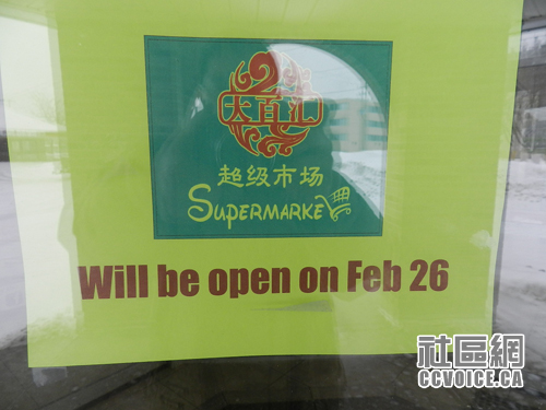 从门窗上贴出的告示看,大百汇将于2月26日开业。从透过门窗看,大百汇货品齐全,包括有鲜肉、活鱼/海鲜、冷冻食品、蔬菜、水果、大米、调味料、小吃、杂货、日用品、五金等等。计划开业时间周一至周五,朝九晚11,周末9点半至晚上11点,服务电话519-208-0398,估计许多读者在等待大百汇的开业!