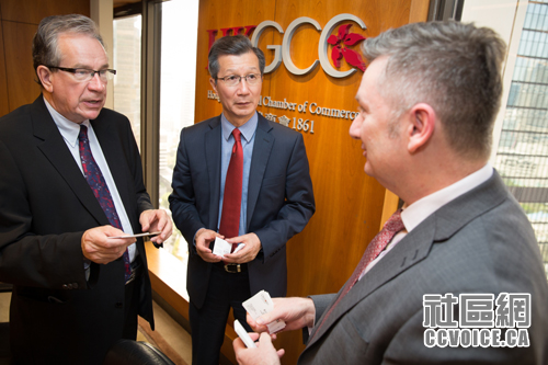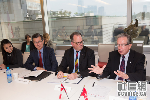 24日清晨,陈国治和李尔在加拿大驻香港总领事柏伊恩(Ian Burchett)以及安大略省驻上海商务贸易代表黄文楚的陪同下,出席了香港加拿大商会为他们举办的早餐会,这家商会具有38年历史,代表了一千多个在加拿大、香港和中国内地有业务的企业会员,是加拿大境外最大的加国商会组织。它的会长韦梓强(John Witt)及多位商会理事对来自家乡的商务代表团表示欢迎。