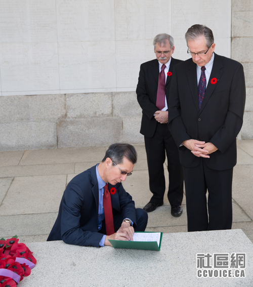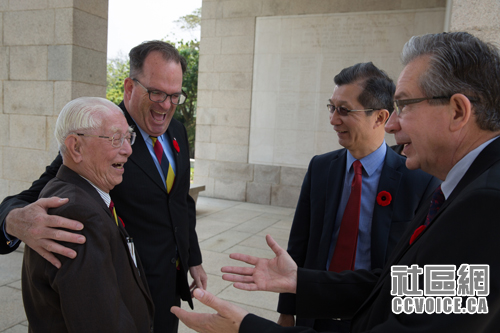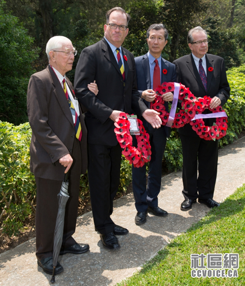 陈国治和李尔还前往在葬有280名加军阵亡士兵的西湾国殇纪念坟场,在驻港总领事和二次世界大战退役军人会所会长、90多岁高龄的华藉英兵蔡彼得先生的陪同下,向二次大战期间香港保卫战期间阵亡的加军士兵敬献花圈。