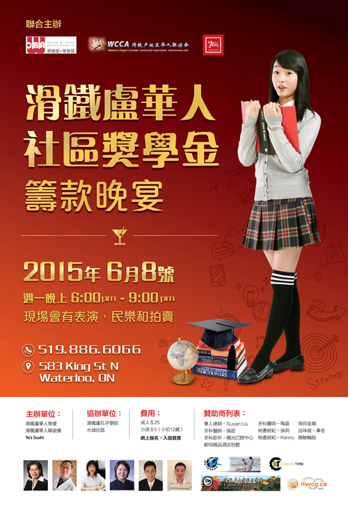 春暖花开,莺飞草长。一年一度的滑铁卢华人社区奖学金筹款活动又拉开了序幕。滑铁卢华人社区奖学金的主要目的是奖励华人社区优秀的学生,同时也是华人团体和商家回报社区的慈善助学活动。自2012年水城社区发起第一届社区奖学金以来,收到了社区各界广泛关注和大力支持。今年的奖学金筹款活动由滑铁卢华人商会,滑铁卢华人联谊会以及Ye’s Sushi联合主办。我们诚恳邀请滑铁卢华人社区和各界人士来参加2015年滑铁卢华人奖学金筹款晚宴。筹款晚宴的具体细节如下: