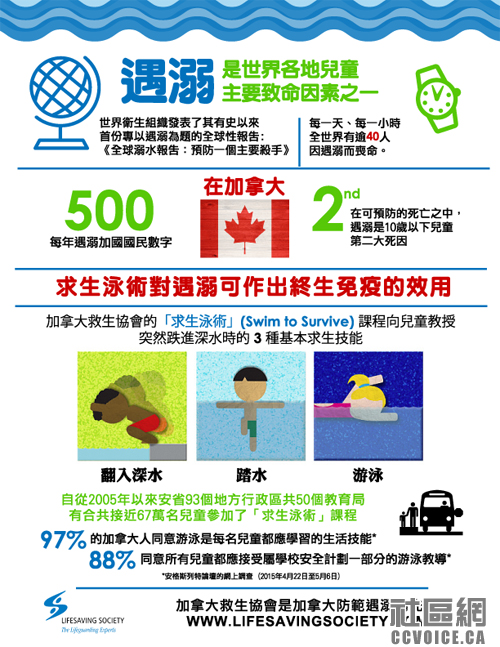 加拿大救生协会于2005年推出“求生泳术”(Swim to Survive)课程,这个以学校为本的计划,向3年级学生教授突然跌进水中时的3种必要求生技能。该课程源自加拿大救生协会的构想:加拿大每个儿童都应学习基本的求生泳术。在一个有丰富水源的国家,懂得游泳是很重要的。