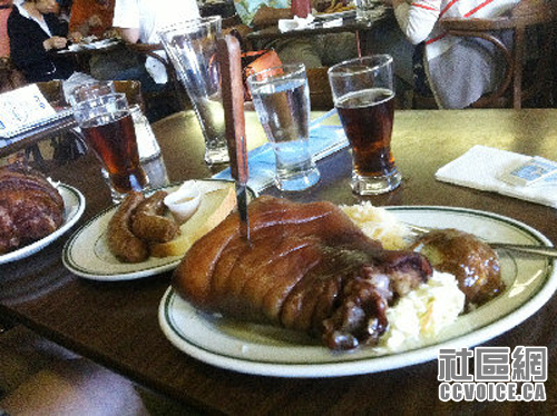 陈洁首先去的地方,是要去品尝在华人社区中口碑相传的德国烟熏猪脚,这家以烹饪猪脚出名的餐馆名叫The Olde Heidelberg,古老风格的餐馆门口摆放著酿酒的金属罐子,进入餐馆一看,大部分在此用餐的都是慕名来此品尝德国猪脚的华人顾客。点了一份烟熏猪脚,刚烤出来的猪脚非常新鲜,份量十足,两个女生吃都足够了,配著德国酸菜,吃起来觉得味道还不错。他们还点了餐馆自酿的德国巴伐利亚风格黑啤酒。新鲜酿造的啤酒味道清爽,值得一试,家庭式的餐馆服务亲切。他们本来还想多点一些烟熏猪脚外卖带走,但是餐馆说客人太多,猪脚供应不够,不能外卖。