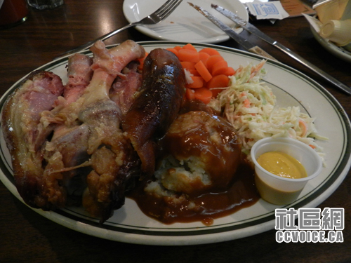 肘子分量很足,满盘都是大块,我和老伴合吃一份,以免胆固醇超标。老朱说,如果是在家里,这一盘得吃好几天。我们招待Don独用一份,他开车辛苦了。每客$14.95,加税13%和小费,再加啤酒,每客不到$20。我们离开时就盘算什么时候再来呢!