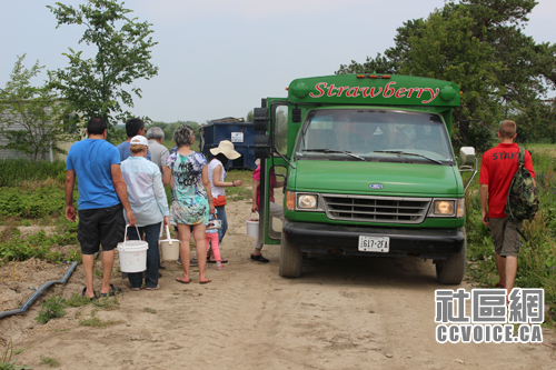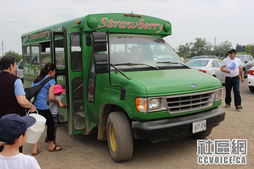 长话短说,到达之后,花钱买了一个桶,$2,然后按人头交了$5(小孩要5岁以下才免费),当然农场给你返回了$15的现金券,抵扣草莓的。农场安排有一个很古老的校车,将大家从农贸市场运输到田间。在车上,工作人员强调了两点,第一,尽管在野外,请大家不要吸烟;第二,由于田间地头有不同机械在工作,大家不要步行回来,而是搭乘校车回来。