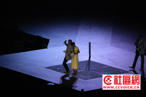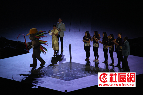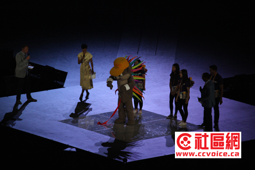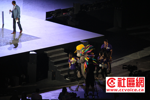 在7点差一刻开始,泛美运动会开幕式现场已经非常热闹。人流不断流入的同时,Rogers Center里面也开始有一些活动来活跃现场。先是CBC三位主持人,两男一女主持现场,英语法语解说,然后邀请名流讲话搞活现场。特别高潮就是泛美运动会吉祥物Pachi来到现场,秀出反美运动会的体育项目,同时现场学跳舞,当然Pachi是由其发明者陪着送上舞台的,请看现场报道。