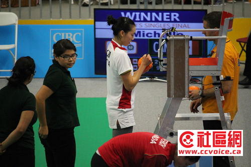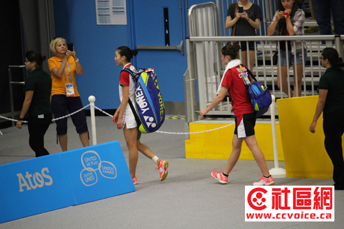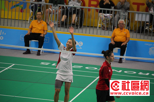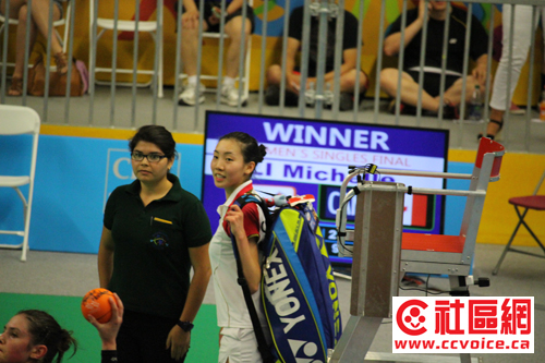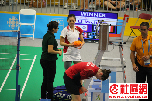 与队友Honderich Rachel争夺冠亚军决赛中,华裔巾帼Michelle Li分别以21:15和21:9的好成绩夺得金牌。第一场比赛耗时15分钟,第二场比赛仅11分钟结束。请看现场图片报道。