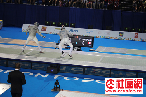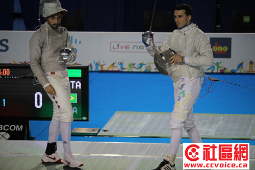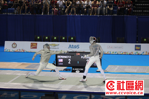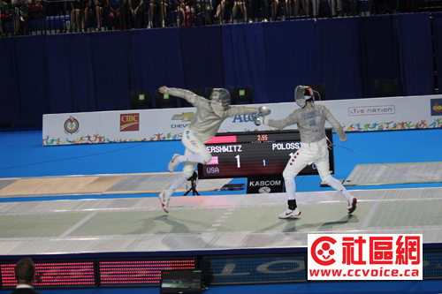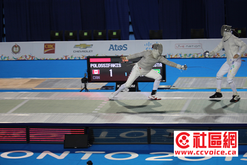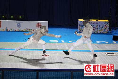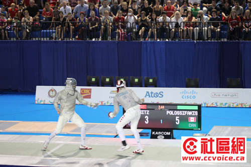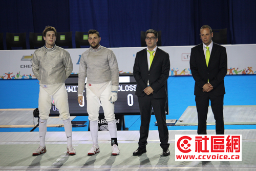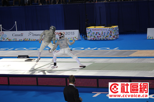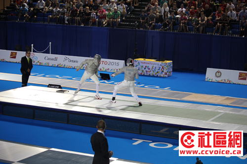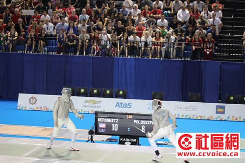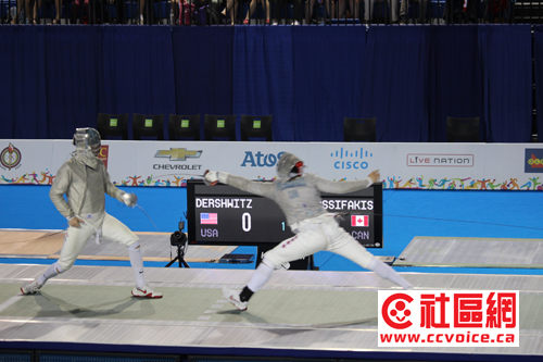 泛美运动会在紧张进行着,7月20日傍晚,男女佩剑(Sabre)比赛准时开始。首先是男子四分一赛,加拿大选手Polossifakis Jos.以15:13险胜巴西队Agresta Renzo,而美国队Dershwitz Eli以15:4轻取阿根廷队Bustamante Ricardo。接下来,金银牌争夺赛在加拿大与美国队之间进行。尽管开始加拿大队员还领先几分,也尽管现场啦啦队在“死磕”,但加拿大选手最后不敌对方的猛烈攻势,9:15败北,获得银牌。请看现场图片报道。