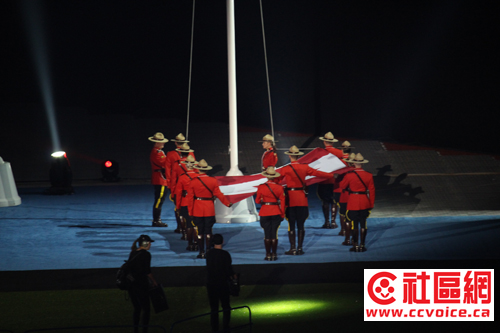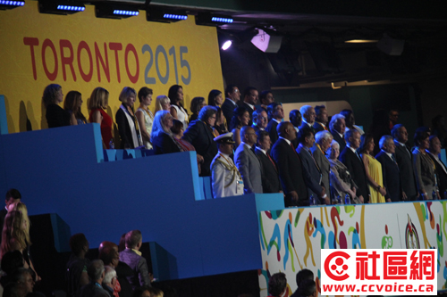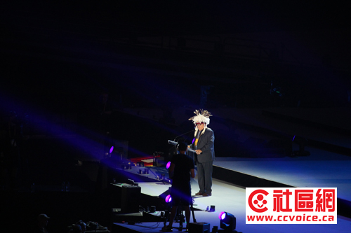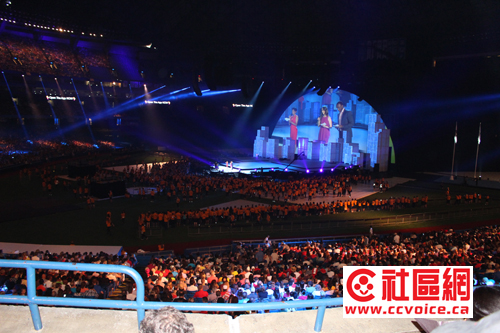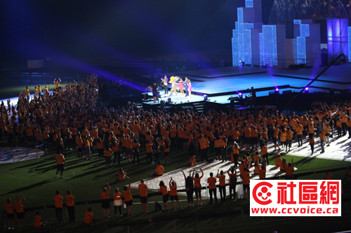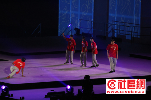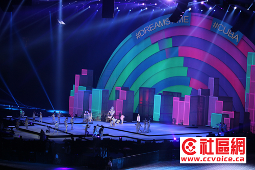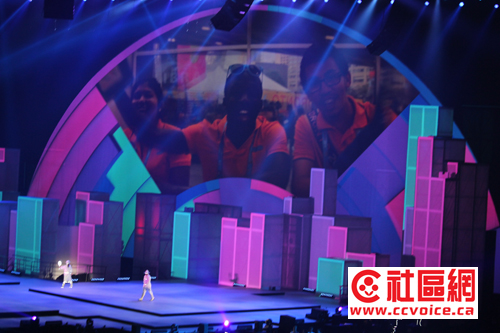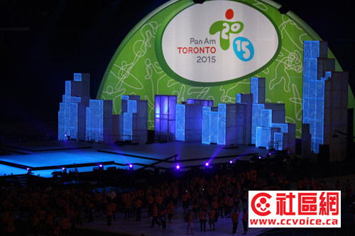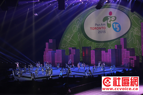 通过背景灯光以及舞台人物,是不是在演绎不同国家运动员们首次到达多伦多时的感受呢?