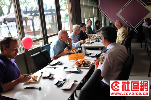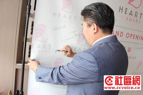 中国驻多伦多总领事馆商务参赞于建伟对于有幸第二次参加Heart Sushi的开业庆典表示祝贺,他称尽管Heart Sushi并没有那种超大型店堂,但是所做的特定装修,所提供的美食,估计不仅是华人同胞的喜爱,更受其他族裔和本地西人的欢迎,在店里用餐,你能够确实感觉到他们是用心来准备每一道佳肴。皮尔去消防总长Tim Beckett和密市第12去警察总长Rob Ryan风趣地表示,尽管自己还没有品尝Heart Sushi,但估计老板不久就会看到消防队的许多同事光临,因为大家都爱吃寿司。Heart Sushi总裁Kery Chen对大家的热情支持表示诚挚的谢意,希望大家喜欢这里所提供的食品。
