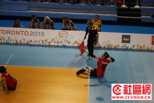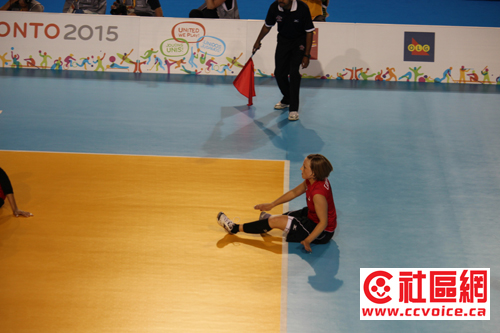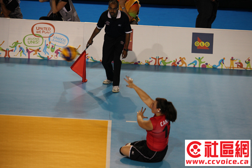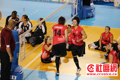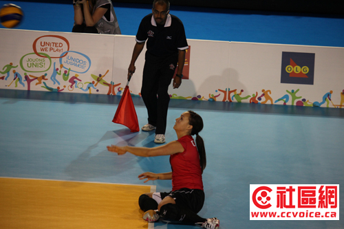 在泛美残运会上,女子Sitting Volleyball(坐式排球)小组赛第一场赛事8月9日下午举行,加拿大战美国队。从队员入场的那一刻,观众估计就感觉到了,美国队中有几名大姐大,身材高大壮实,而加拿大队相对要苗条,瘦小得多。在简单预热之后,比赛开始。