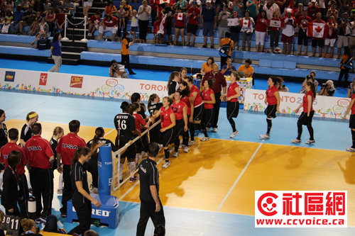 尽管加拿大队获得发球权,但美国队基本控制了球场。2分钟下来,加拿大队0:5落后,教练紧急暂停,调整战术。但总体来说,美国队的优势过于明显,分别以25:1、25:14和25:11,连输三局,结束比赛。请看图片报道。