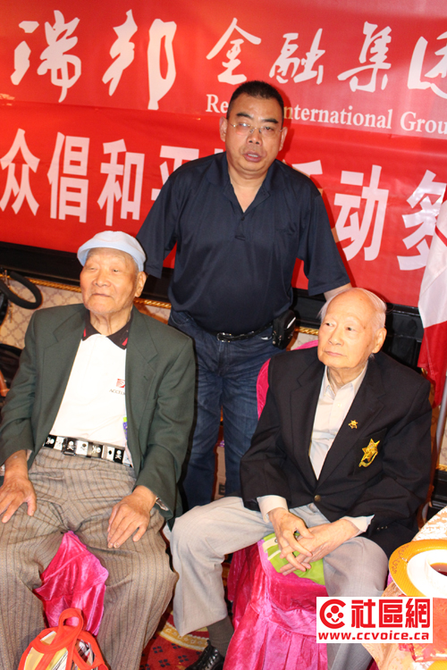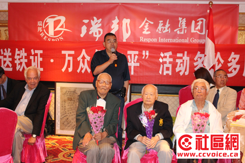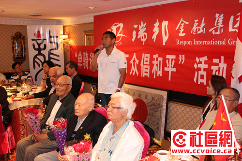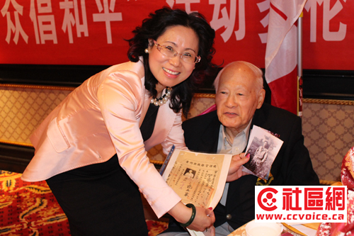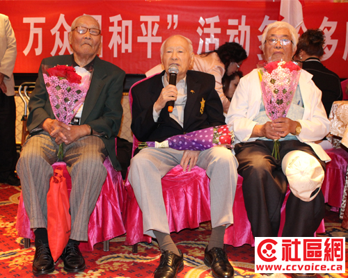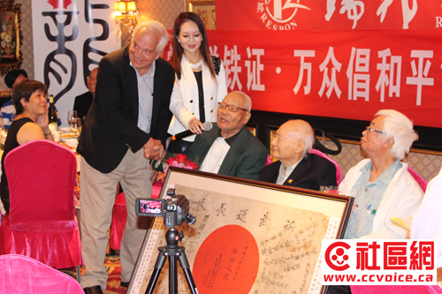 在嘉宾致辞中,John McCallum感谢抗战老兵当年所做出的贡献与牺牲。他特别强调说,作为前任国防部长,他有机会对战争说“不”。前国会议员粱中心也应邀讲话,通过对自己父母的回忆,介绍了当年抗战的情况。陈国治厅长指出,尽管当年加拿大本土远离战争,但是并没有与战争绝缘。相反,当年安省是世界反法西斯战争武器生产地。无论是诺曼底登陆,还是香港保卫战,到处都有加拿大士兵的身影,他们为二战胜利做出了应有的贡献。钟领事在介绍当年抗战中国民党军队在主力战场消灭日本有生力量的同时,呼吁大家不要忘记共产党所领导的敌后游击队所做出的牵制与打击日军的努力,以及中国对世界反法西斯战争所做出的重大牺牲。