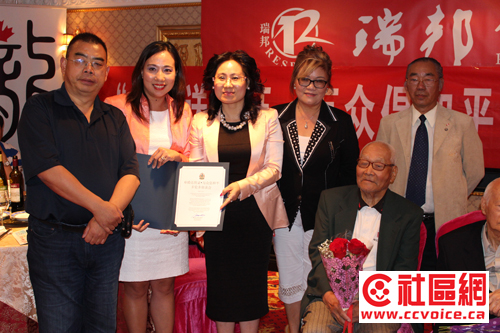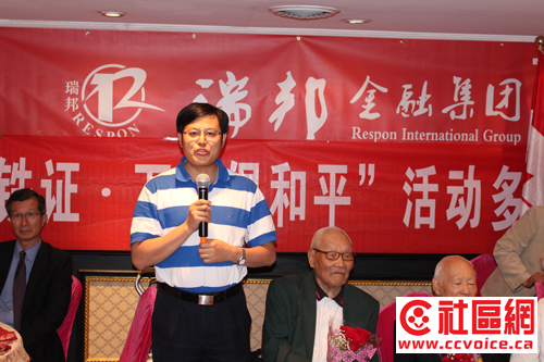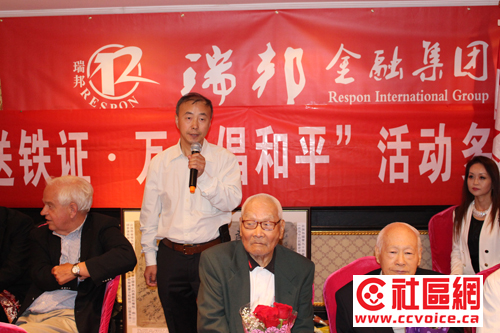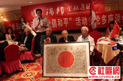 8月12日晚,多伦多富丽堂皇的紫京盛宴宴会厅,近百位华社名流济济一堂,笑语声喧。瑞邦国际金融集团、加拿大国际电视台、加拿大枫叶龙多元文化协会、世界华人周刊在此联合举办“瑞邦金融之‘单骑送铁证·万众倡和平’多伦多座谈会”,用枫叶之都的特有热情,来欢迎刚刚结束美国纽约、华盛顿采访风尘仆仆赶来的“单骑送铁证北美科发行”团队成员。当晚到场嘉宾有前联邦国会议员John McCallum和粱中心,安省移民、公民与国际贸易厅长陈国治,万锦市议员杨绮清,中国驻多伦多总领事馆钟洪糯领事,Don Valley North国会议员谭耕博士,以及众多社区侨领和文化名人。令到场嘉宾动容动情的是,主办方还邀请三位抗战老兵与大家现场互动,令到场的十几家华文媒体记者收获颇丰。